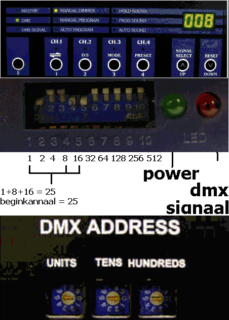 Dus met DMX kunnen verschillende toestelen door 1 kabel worden gestuurd. Het aantal apparaten hangt af van hoeveel kannalen een toestel heeft .Dit vormt dan als je eerste toestel start op 1 en deze heeft 9 kannalen dan begint het tweede toestel op kannaal 10.Je kan ook verschillende toestellen op één kannaal plaatsen WANT: bij de betere stuurtoestelen stuurt hij na het laatste kannaal het stopsignaal om zo sneller zijn start te kunnen geven dus een slimme sturing geeft meestal enkel de gebruikte kannalen wat er voor zorgt dat de sturing voor weinig toestelen sneller zal verlopen Om te zorgen dat elk apparaaat de juiste informatie ontvangt heeft ieder apparaat een adres, dipswitches of knopjes.